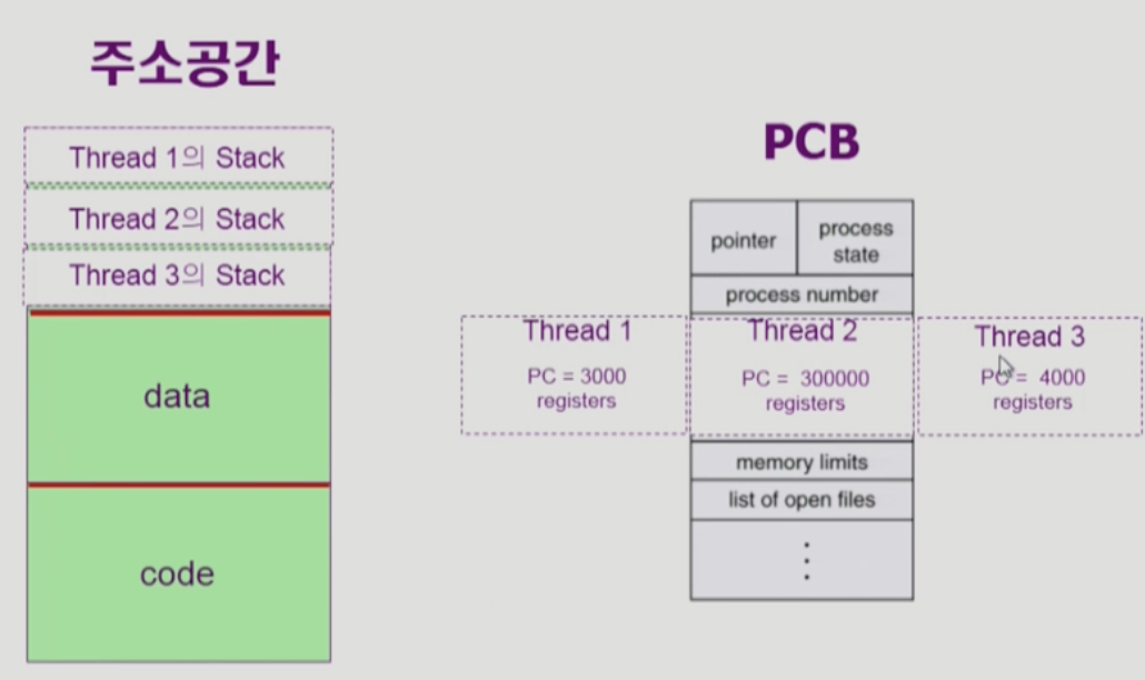 프로세스가 실행되면 주소공간(코드/데이터/스택)이 만들어지고 이러한 프로세스 정보를 운체의 PCB에 담겨 관리된다. 이때 동시성 프로그래밍에서 여러개의 스레드를 돌린다는 것은 하나의 프로세스의 코드 데이터까지 띄워놓고 PCB에서 코드의 어느부분을 실행하고 있는지 알려주는 PC(Program Counter)를 병렬로 가지고 있는 것이다. 그리고 PC 하나하나의 정보를 담고 있는 것이 바로 Thread이다. 다시말해 스레드는 하나의 프로세스에서 여러개의 수행단위를 두고 각 개별 수행단위를 일컫는 것이다.