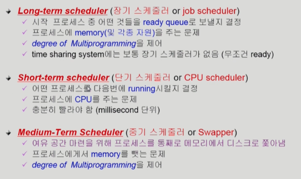 장기 스케쥴러는 프로세스 중 어떤 것들을 ready queue로 보낼지 결정한다. 즉 프로세스에 memory를 주는 문제를 관리한다. 하지만 time sharing system(요즘 쓰이는 리눅스 윈도우 등등)들은 장기 스케쥴러가 없이 이미 프로세스가 메모리에 올라온채로 시작한다.