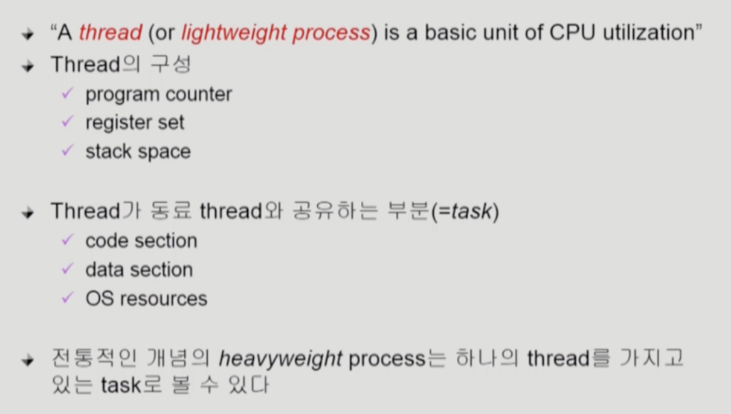 정리해보자면 Thread는 CPU의 수행단위이다. 따라서 하나의 프로세스의 스레드들은 코드, 데이터, OS자원을 공유하게된다(공유하는 부분을 task라고 부른다). 스레드들간의 별도로 가지고 있는 부분은 3개 - Program Counter, Resgier Set, Stack - 이다. 이러한 특성탓에 스레드를 가벼운 프로세스, lightweight process 라고 부르기도 한다.