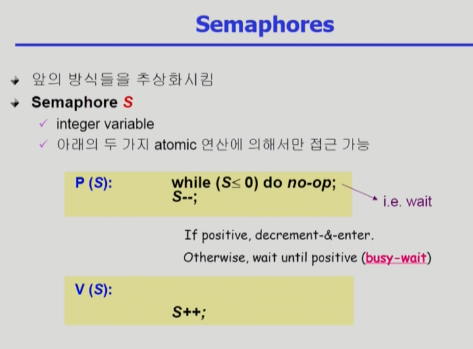 하지만 이러한 세마포에서도 busy waiting 문제는 여전히 발생한다. 만약 누군가 들어가 있어서 뮤텍스 값이 0일 때 P연산을 하면 P연산의 While문에서 무한루프가 돌아가 CPU를 빠져나오지 못하고 while문만 돌다 할당시간이 끝나버리기 때문이다.