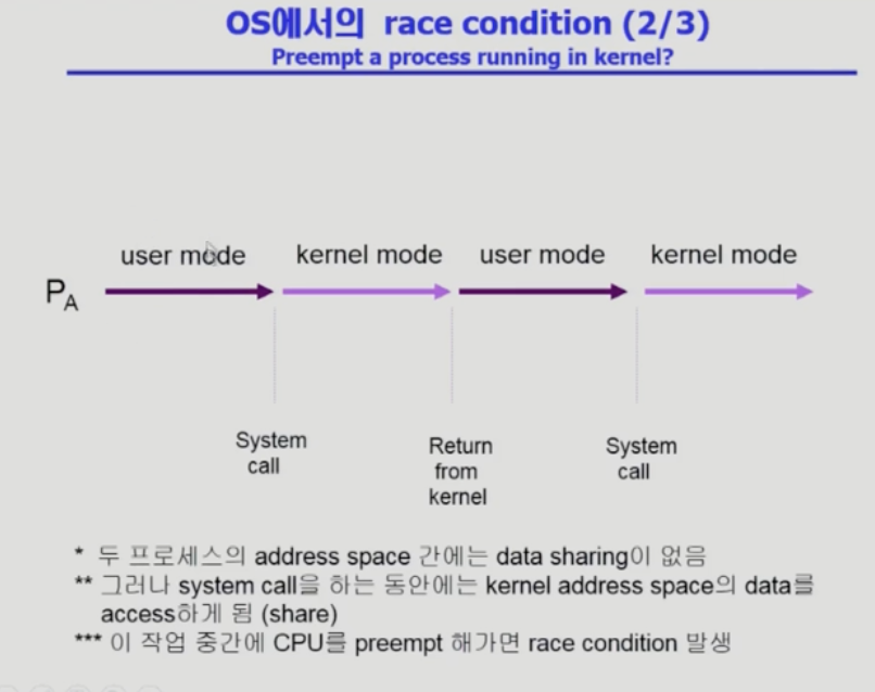 race condition은 CPU가 한 개일때도 발생할 수 있다. 한 프로세스가 CPU를 가지고 일을 하다 운영체제에게 시스템 콜을 한다. 이렇게 운영체제 안의 데이터값을 바꾸고 있을 때 자신의 CPU할당시간이 끝나버려 다음 프로세스에게 넘어간다. 이 때 다음 프로세스도 시스템 콜을 하게되면서 그전의 프로세스가 날린 시스템 콜이 건드리는 커널의 데이터와 겹치게 되면서 경쟁상황이 발생한다. 즉 프로세스에 의해서도 경쟁상황이 발생한다.