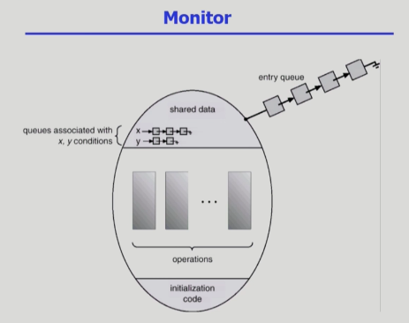모니터는 공유데이터에 접근할 수 있는 경로를 셋팅함으로써 이전 세마포에서 발생하는 문제 (함수 내부에서 p,v로 인한 버그잡기 어려움)를 보완할 수 있다. 이렇게 경로가 미리 셋팅이 되어있으면 경로에 들어가는 프로그램이 구구절절 락을 걸고 풀고 작업을 할 필요가 없어진다. (이미 모니터 자체에 동시접근을 막아놓음). 결국 모니터는 임계 구역(critical section)과 이를 제어하는 메커니즘을 포함하는 하나의 추상 데이터 타입(Abstract Data Type)이다.