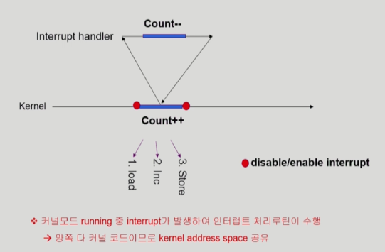 첫번째 경우를 간단한 예로 들면 커널이 CPU를 사용해 1증가시키고 있을 때 인터럽트가 들어와버려 ++가 안먹히고 --를 할 수 있다. 이를 방지하기 위해서는 커널이 cpu를 통해 작업을 하고 있을 때는 inturrpt 거는걸 금지시키는 방법이 있다.