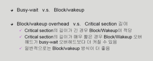 성능면에서 봤을 때 일반적으로 Block/WakeUp이 더 효율적이기는 하다. Busy-Wait 방식은 대기를 하는 프로세스가 CPU에서 계속 동작하고 있기 때문이다. 만약 Critical Section의 길이가 매우 짧은 경우 WakeUp도 일종의 오버헤드이기 때문에 busy-wait가 좀더 효율적일 수 있다. (하지만 busy wait문제는 여전히 존재)