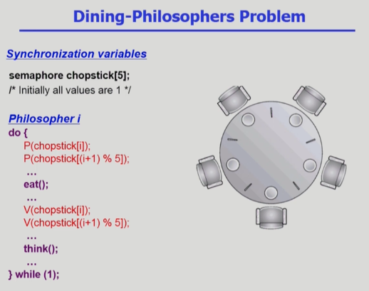 이러한 데드락에서 Starvation으로 이어지는 문제는 철학자의 식탁문제로도 설명할 수 있다. 탁자에 둘러앉아 식사를 하는데 한 사람이 오른쪽 젓가락을 쓰고있고 왼쪽 젓가락을 기다리고 또 옆에 사람은 왼쪽 젓가락을 기다리고 오른쪽 젓가락을 쓰고있는.. 자기 젓가락을 안내려놓고 서로의 젓가락을 기다리기만 기다리는 상황을 Dining-Philosophers Problem 이라고 한다.. 이때 젓가락은 공유데이터이고 세마포의 경우 1로 설정되었다고 볼 수 있다. 일종의 데드락 상황이라고 볼 수 있으며 이를 해결하기 위해서는 젓가락 두개 모두 집을 수 있을 때만 젓가락을 집을 수 있게하는 방법이 있다. 또다른 방법으로는 데드락을 해결하는 대표적인 방법인 짝수(홀수) 철학자는 왼쪽(오른쪽) 젓가락부터 잡도록 설계하는 방법이 있다.