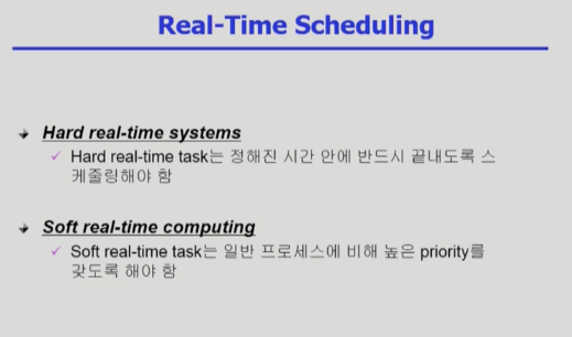 realtime scheduling을 살펴보면 Hard real time system의 task는 정해진 시간안에 반드시 끝내도록 스케쥴링 해야한다. 데드라인을 지키는 것이 매우 중요하기 때문에 offline 스케쥴링이 많다 (offline: 미리 프로세스들이 언제 도착할지 알고있음).반면 Soft real time system 은 정해진 시간에 완수하지 못하더라도 높은 priority의 작업으로 할당해야한다(동영상 스트리밍 etc), 따라서 online 스케쥴링으로 된다 (프로세스 도착 시간 미리 생각안하고 그때그때 처리).