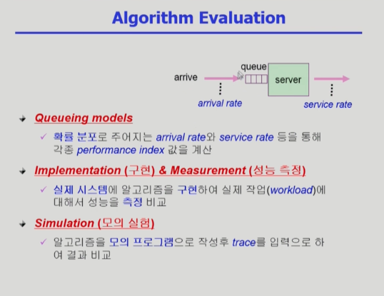 알고리즘 성능평가 방법에는 크게 3가지 방법이 있다 (Queueing models, Implementation(구현)&Measurement(성능측정), Simulation(모의 실험))