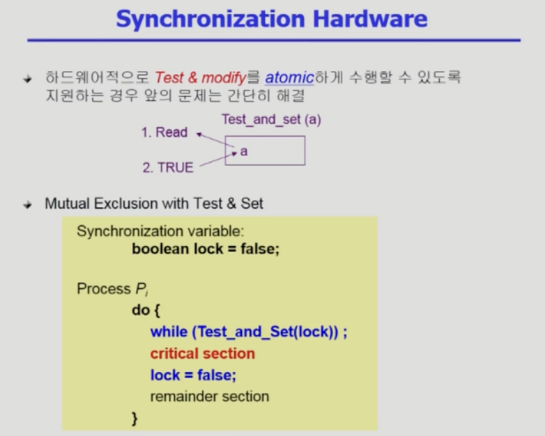먼저 하드웨어 측면을 보자면 하드웨어에서 데이터를 atomic하게 작업할 수 있도록 해준다면 문제를 해결할 수 있다. 즉 접근과 수정을 하나의 단위로 묶는 작업(Test and set) 으로 하드웨어에서 보완하는 것이다. 이렇게 되면 단순히 작업할 때와 하지 않을 때 락을 걸거나 풀기만 하면 된다.