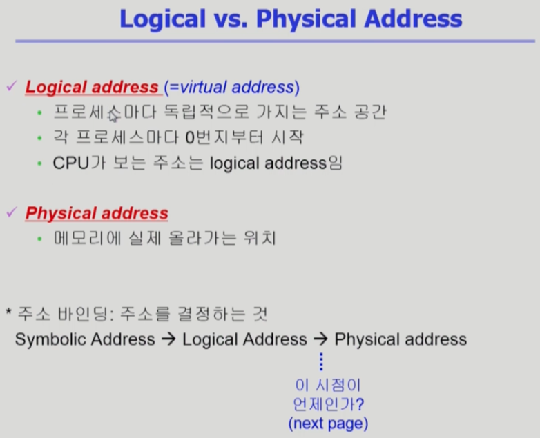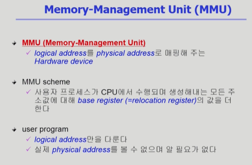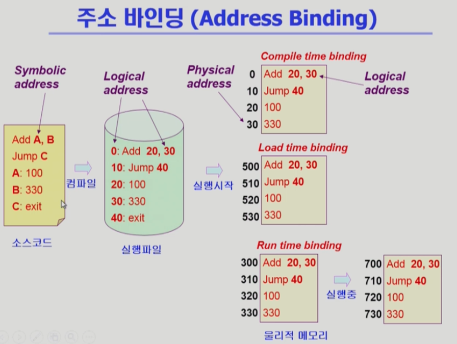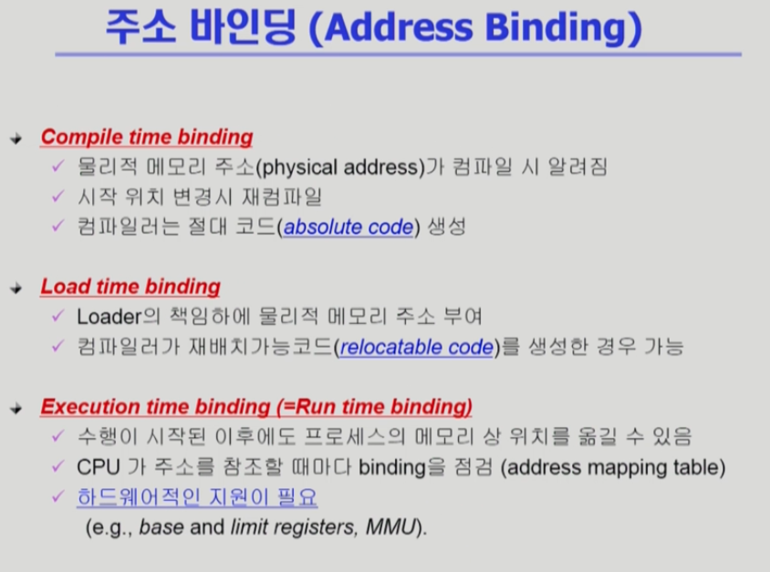 프로그램 실행때 논리적 주소와 물리적 메모리 주소가 바인딩 + 프로그램 실행 이후에도 주소가 바뀔 수 있음 -> CPU가 주소를 참조할 때마다 주소 바인딩을 점검하기 때문에 하드웨어적인 지원이 필요하다.