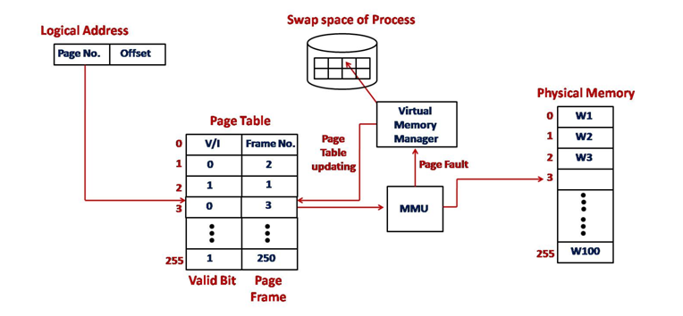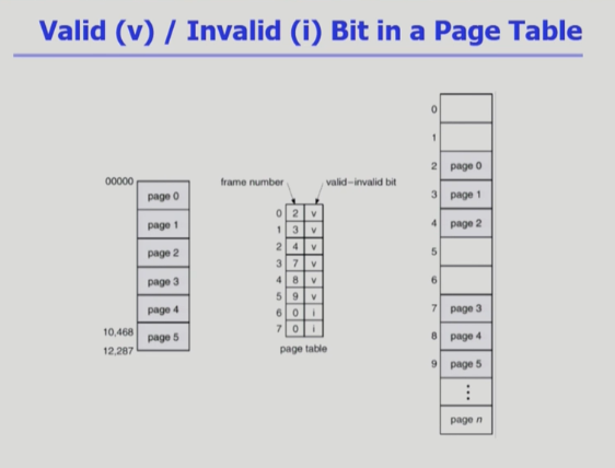 페이징 기법을 통해 프로세스를 작은 단위로 나누어 관리할 때 물리 메모리를 찾아가는데 있어 페이지 테이블을 조회하게 된다. 페이지 테이블에서는 먼저 페이지 번호와 프레임번호를 조회후 물리주소를 확인한 뒤에 valid-invalid bit에서 1(Valid)을 확인한 후에야 물리 메모리로 접근하게 된다. 이러한 valid bit 덕분에 운영체제는 커널영역 주소를 접근하지 못하게 할 수 있거나 잘못된 물리주소 접근을 못하게 보호할 수 있다.