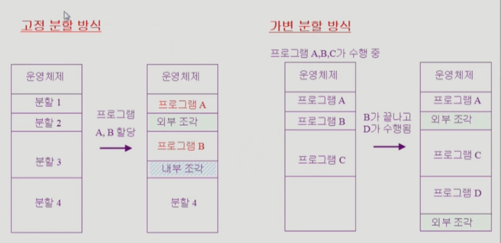 연속할당에서는 두 가지 방식이 존재한다. - Fixed partition(고정분할) 방식과 Variable partiiton(가변분할) 방식이다.
