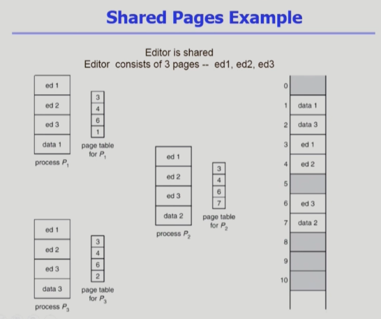 "Shared code"는 여러 프로세스가 동일한 코드 영역을 공유하여 메모리를 절약하는 방법이다. 이를 통해 여러 프로세스가 공통으로 사용하는 데이터를 메모리에 한 번만 로드하고, 이 메모리 영역을 여러 프로세스가 참조할 수 있게 한다. 이러한 공유 가능한 코드를 read only 로 셋팅해서 올리는데 이러한 코드들을 Re-entry code(=pure code)라고 부른다. 따라서 shared code는 모든 프로세스의 logical address space 를 공유하고 있어야한다.