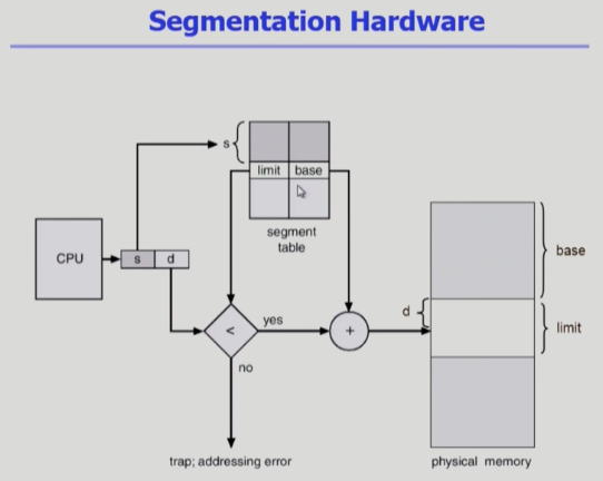 CPU가 메모리를 얻기위해 세그먼트 넘버와 offset을 던지면 세그먼트 번호는 세그먼트 테이블에서 주소위치를 찾아 물리 메모리 주소로 찾아가고 offset으로 물리 메모리 영역을 인식한다. 이때 세그멘트는 limit이라는 정보가 있는데 페이지는 크기가 다 똑같으니 상관없었지만 세그먼트는 크기를 알기위해서 limit이라는 정보를 테이블에 따로 두어 만약 offset보다 limit이 클경우 당연히 잘못된 요청이므로 바로 에러처리한다.
