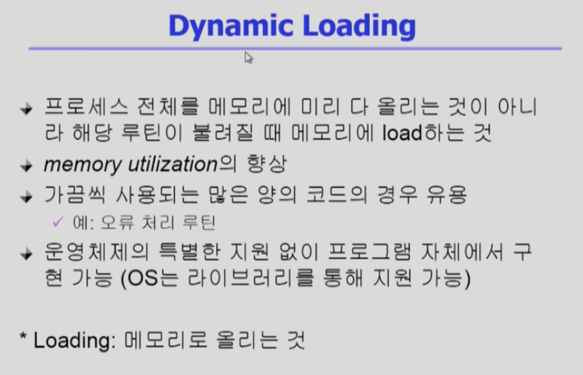 메모리에 동적으로 올린다는 것은 프로세스 실행시 미리 메모리에 다올리는게 아니라 필요할 때마다, 호출될 때마다 올리는 것이다. 보통 다이나믹 로딩은 OS단에서 좀더 상위 프로세스에게 라이브러리를 제공함으로써 권한을 넘겨 주로 프로그래머가 작성하게된다.