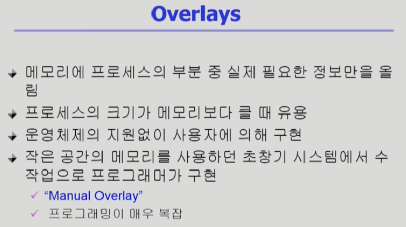 메모리에 필요할 때 그때그때 올려둔다는 점에서 다이나믹 로딩과 같으나 예전 메모리 크기가 워낙 작을 때 메모리를 효율적으로 이용하기 위해서 큰 프로그램을 쪼개서 특정 부분이 실행되면 특정부분이 메모리에 올려 실행시키는 과정을 개발자가 수작업으로 진행했다. 따라서 이를 Manual overlay라고도 불렸고 매우매우 복잡했다. 다이나믹 로딩과의 차이점은 라이브러리를 통해 손쉽게 동적 주소바인딩을 했다면 오버레이는 라이브러리 없이 손수 한땀한땀 동적 바인딩을 한 것이다.