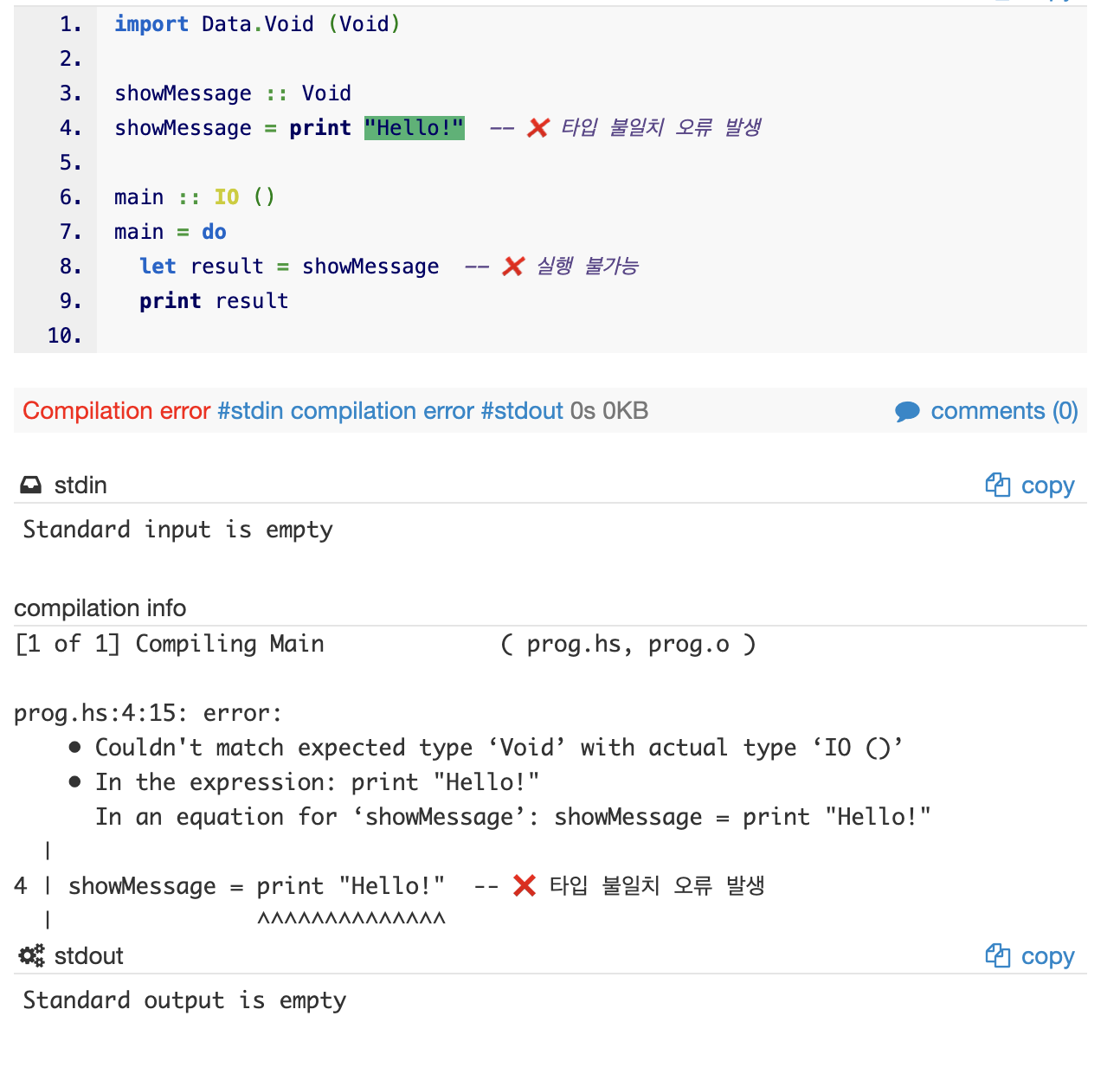 Haskell 에서 print(hello)를 실행하는 코드를 작성하면 위와같이 에러가 발생하는 것을 알 수 있다. Haskell 같은 함수형 언어에서는 void타입이 절대 값이 존재할 수 없는 타입이기 때문에 단순 print(Hello)를 찍더라도 어쨋든 무언가를 반환하고 있어서 타입 불일치 오류가 발생하는것이다.