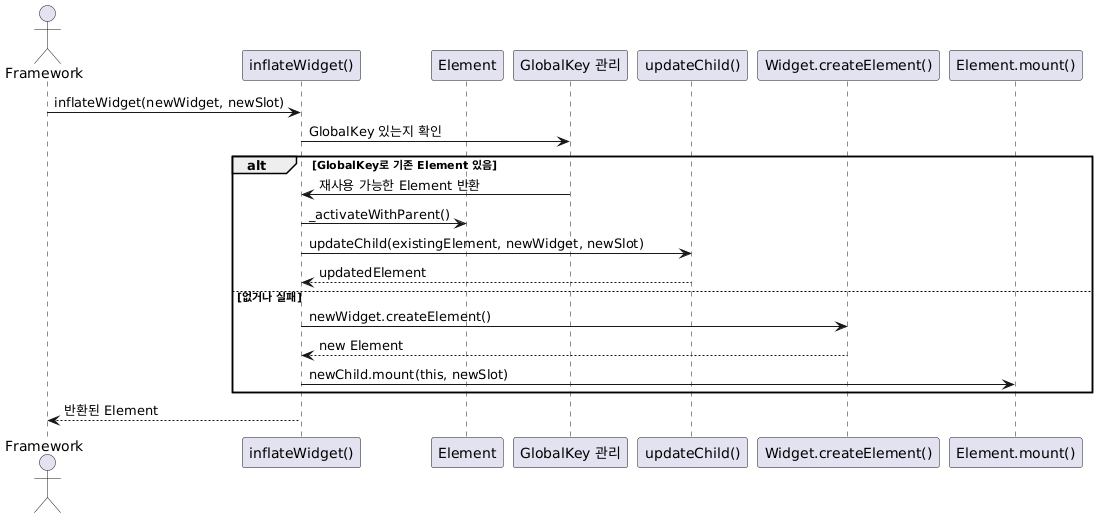 껍데기인 Widget에 내용물을 채워주는 역할은 InflateWidget() 함수가 수행한다. (함수 네이밍처럼 껍데기 위젯에 내부를 element로 팽창시키는 느낌이라고 이해하면 좋다!) 이때 inflateWidget 함수는 globalKey가 있느냐 없느냐에 따라 다른 로직으로 위젯을 채우게 된다.