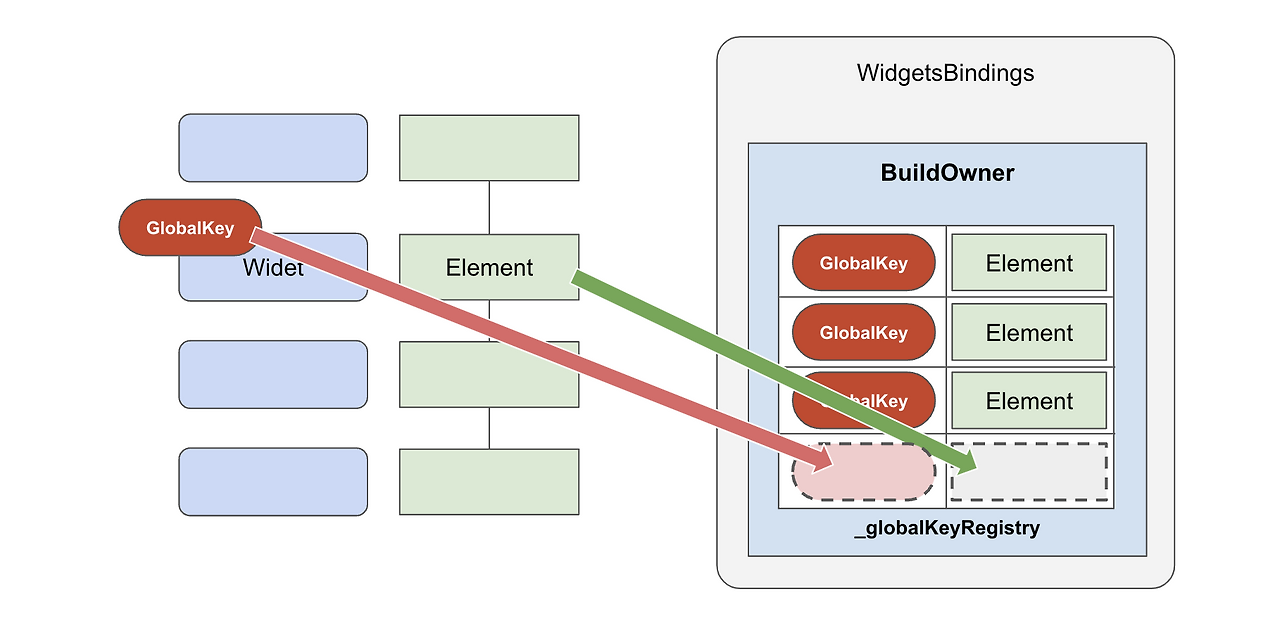한 줄 요약하자면 GlobalKey를 통해 껍데기 위젯에 element를 채워준다는 것만 기억해도 무방하다.