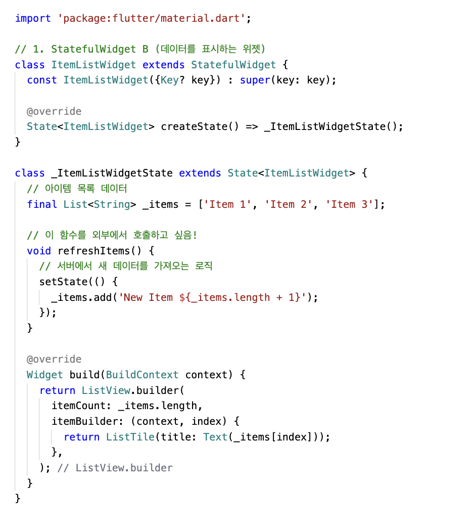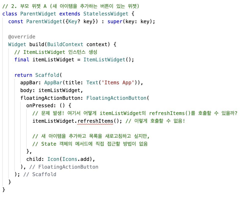 위 코드와 같이 외부클래스/위젯(ParentWidget) 에서는 Stateful 위젯의 Sate객체 메서드에 직접 접근할 수 없다.