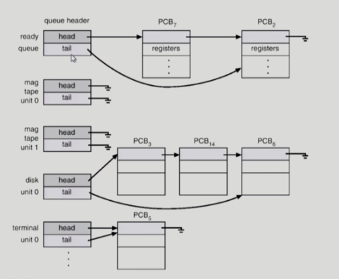 프로세스들이 줄서는 큐에는 세가지 종류가 있다. 프로세스는 각 큐들을 오가며 수행된다. 각 큐들은 위와 같이 링크드리스트 구조이며 PCB들이 줄줄이 연결되어있다. 이 순서에 따라 PCB들을 사용하여 문맥교환이 일어난다.