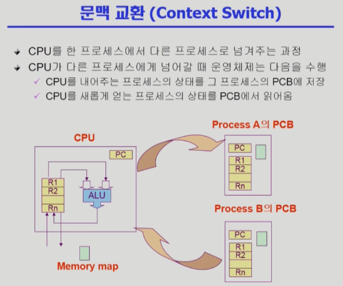 프로세스가 CPU를 점유하다 특정 이슈로 인해 CPU를 뺏기고 다른 작업을 하다 다시 복귀하면 처음부터 다시 시작하는 것이 아닌 이전 작업부터 시작하게 된다. 이와같이 CPU가 Process A에서 Process B 를 넘겨받는 과정을 문맥교환이라고 한다.