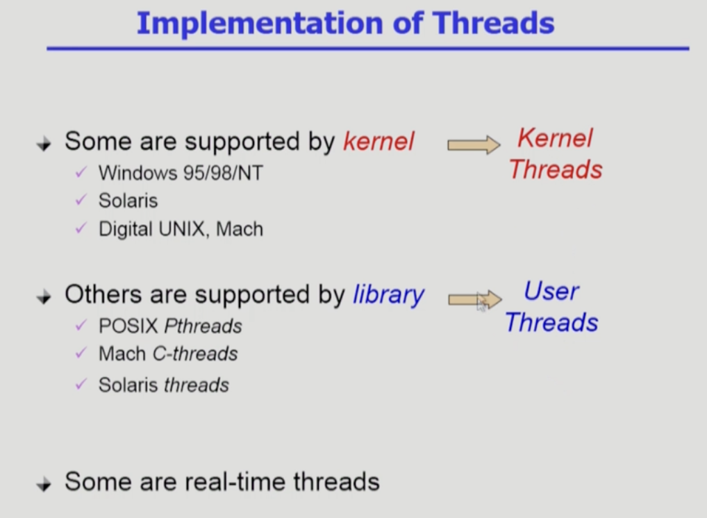스레드 종류는 크게 커널 스레드와 유저 스레드가 있다. 전자는 운체의 스레드 후자는 라이브러리의 스레드이다. 커널스레드는 운영체제가 여러개의 스레드를 사용하고 있다는 것을 알고 CPU 스케쥴링과 같이 각 스레드별로 CPU를 넘겨준다. 반면 유저 스레드는 운체에서 보기에는 하나의 프로세스만 볼 수 있지 내부에 여러스레드가 있는지는 알 수 없다.