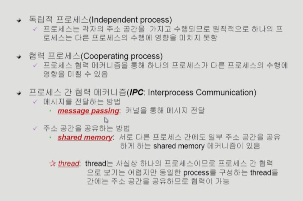 헷갈리지 말것은 스레드는 하나의 프로세스를 두고 여러 스레드가 협력하는 것이지 위와 같이 프로세스간에 협력하는 것과는 엄연히 다르다!