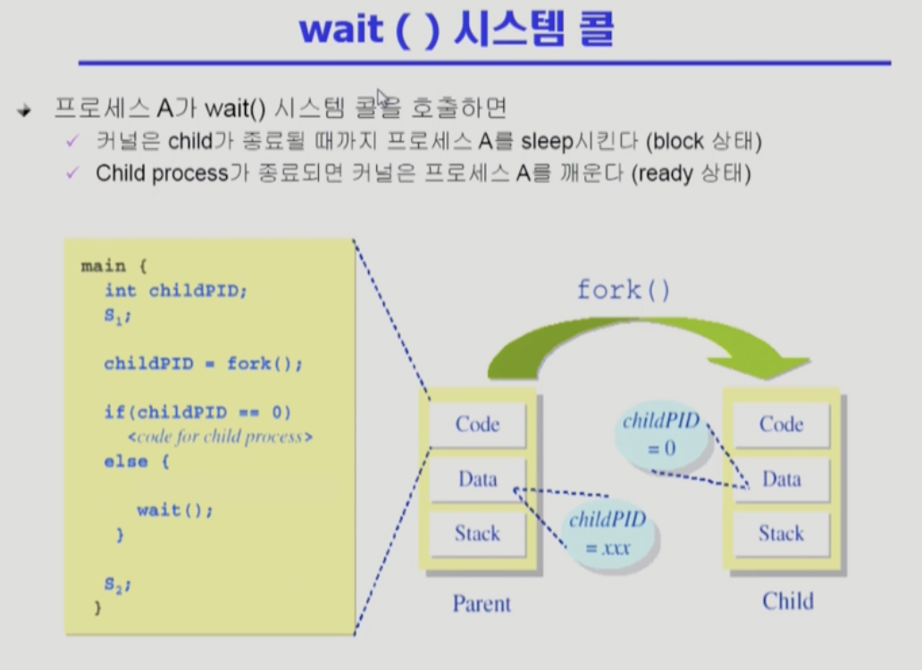 wait 시스템 콜은 말그대로 프로세스 진행을 멈추게한다. 위 예시를 보면 if 문을 통해 자식 프로세스인지 확인하고 이후 자식 코드를 실행시키고 만약 자식 프로세스가 아닌 경우 else문을 통해 wait() 시스템 콜을 호출한다. 이때 else 에는 자식 프로세스가 아닌 부모 프로세스 코드가 들어감으로써 커널은 자식이 종료될 때까지 부모를 잠깐 sleep시키게 한다. 만약 자식 프로세스가 끝나면 이후에 부모 프로세스가 다시 진행되도록 관리한다.