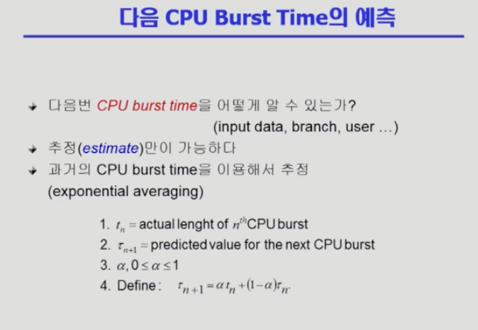 하지만 SJF는 사실상 최적화된 방법임에도 치명적인 두 가지 약점이 있다. 가장 먼저 Starvation 문제가 있다. 계속해서 작업량이 적은 프로세스가 새치기를 할경우 뒤에있던 프로세스가 영원히 처리되지 않을 수도 있다. 두번째는 CPU burst time에 대한 파악이 정확하지 않다는 문제이다. 운영체제는 각 프로세스의 CPU 작업량을 인풋 데이터나 브런치, 과거의 CPU burst(exponential reveraging)등을 종합하여 추정할 뿐이다. 따라서 만약 짧다고 생각해서 CPU 제어권을 넘겼는데 알고보니 CPU작업량을 많이 차지하는 녀석이라면 문제가 될 수 있다.