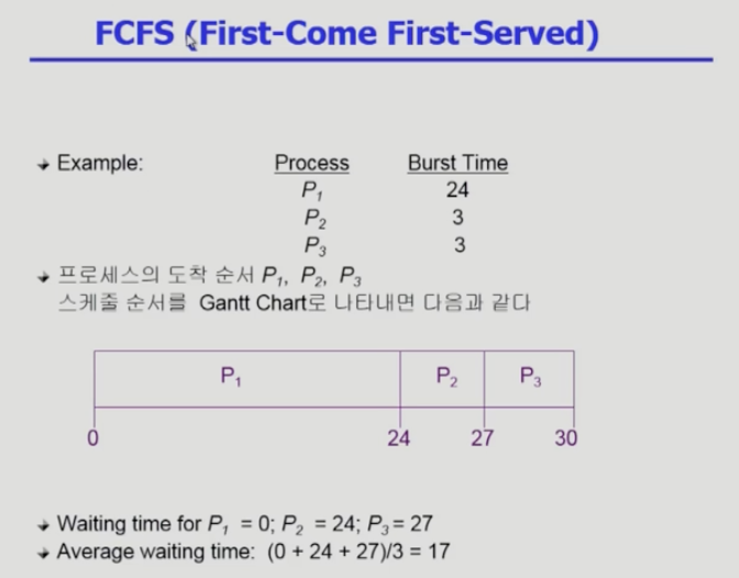FCFS(First-Come-First-Served)는 먼저 도착한 프로세스에게 가장 먼저 CPU 제어권을 준다. 이러한 선착순대로 처리하는 방법(FCFS)는 non-preemptive(비선점형)한 스케쥴링이다. 하지만 만약 앞선 프로세스의 작업량이 많고 뒤이은 프로세스의 작업량이 적은 경우 매우 비효율적인 스케쥴링이 될 수 있다. 이러한 FCFS처럼 순서에 따라 성능차이가 나는 것을 Convoy effect라고 부른다. (Convoy effect: 긴 프로세스가 앞에 도착하는 바람에 뒤에 짧은 프로세스가 오래기다리는 현상)