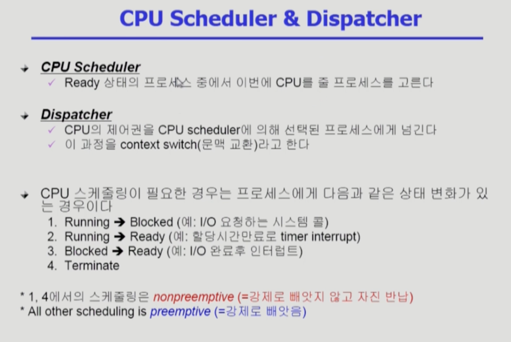 - 1~4 에 해당하지 않는 모든 스케쥴링은 강제로 빼았는 preemptive scheduling (선점형)
