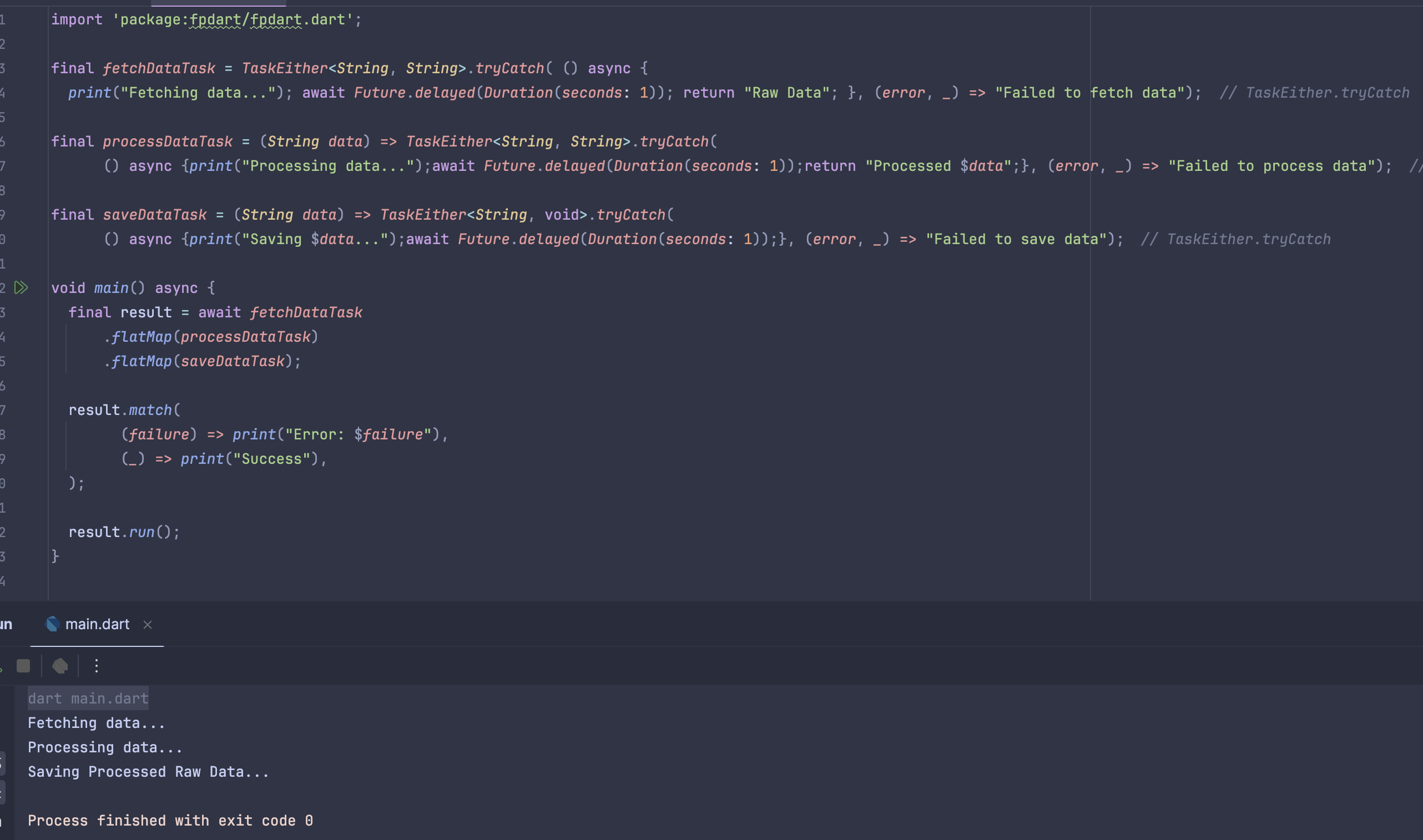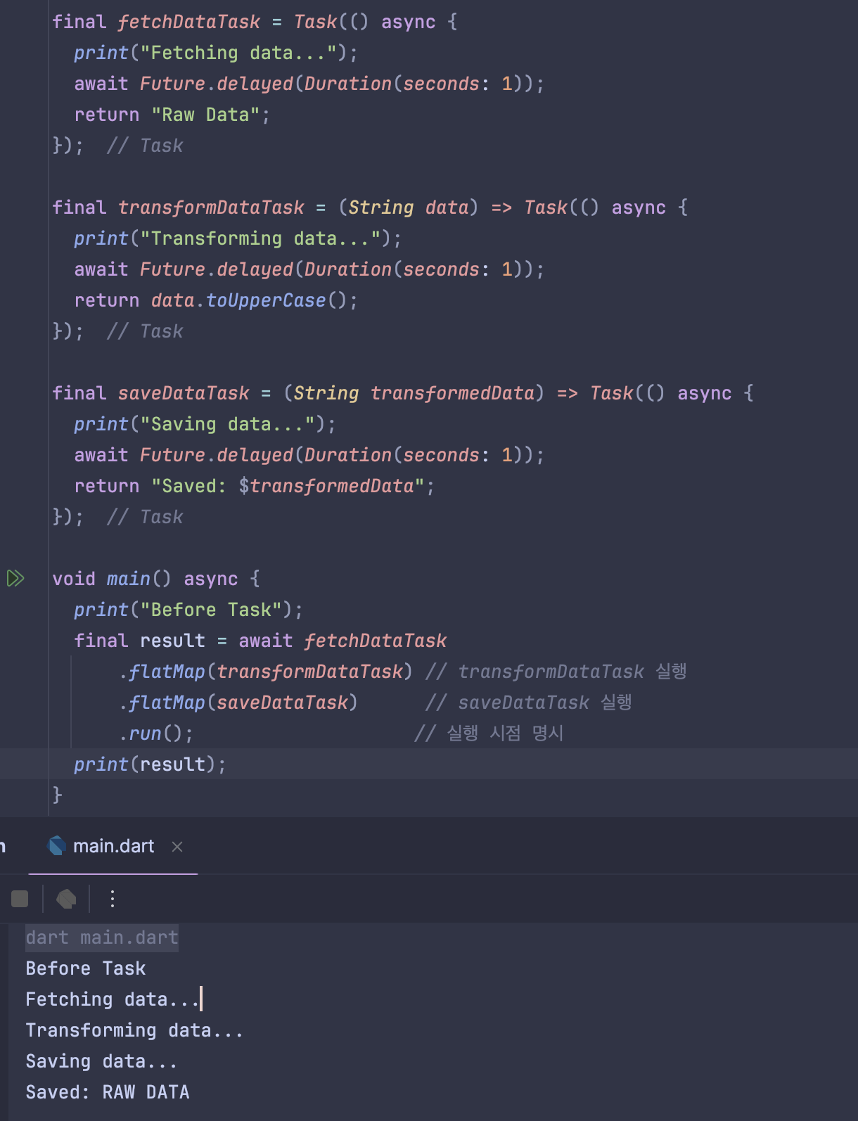 이 코드부터 생각이 조금씩 달라졌다. 이번에도 같은 로직을 왼쪽은 Future, 오른쪽은 Task로 구현한 코드이다. 일단 눈에 띄는점은 오른쪽 코드에서 아직 실행도 시키지 않은 함수에 flatMap 함수로 로직전개를 하고있다는 것이다!!! (이거 저만 신기한거 아니죠?ㅋㅋ) 평소 모나드를 에러처리할 때 Result타입으로만 썻지 함수에 모나드가 적용되는 걸 직접보니 매우 흠터레스팅했다.